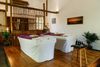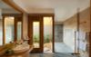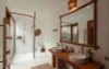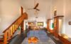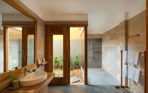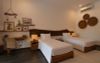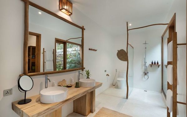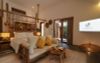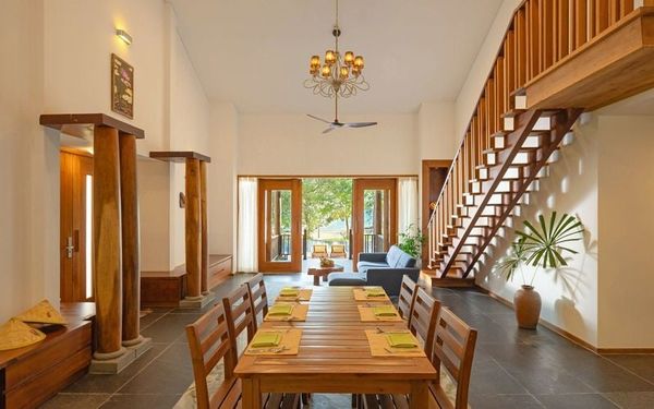 Biệt thự được trang bị những món đồ nội thất gỗ thủ công mộc mạc, được chế tác bởi chính đội ngũ nghệ nhân làm việc tại khu nghỉ, tạo nên vẻ đẹp gần gũi và đậm tinh thần văn hóa bản địa.